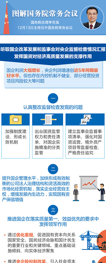 - ●“要贯彻党的十九大部署,着力深化国企改革,在实现国有资产保值增值上下功夫。”李克强总理在12月13日的国务院常务会议上强调。