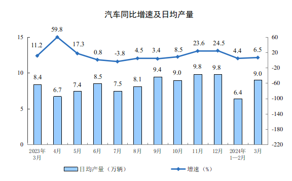 分产品看,3月份,619种产品中有338种产品产量同比增长。其中,钢材12337万吨,同比增长0.1%;水泥15440万吨,下降22.0%;十种有色金属667万吨,增长7.1%;乙烯277万吨,增长3.6%;汽车279.4万辆,增长6.5%,其中新能源汽车88.4万辆,增长33.5%;发电量7477亿千瓦时,增长2.8%;原油加工量6378万吨,增长1.3%。