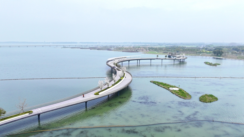 这是跨越元荡湖,连接上海、江苏两地的元荡慢行桥(2024年3月31日摄,无人机照片)。新华社发(沈逸清 摄)