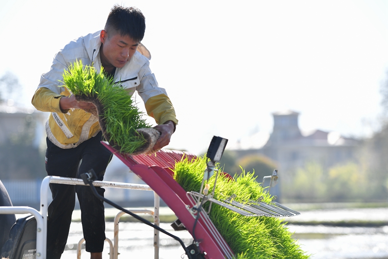 2024年3月29日,在湖南省长沙市望城区高塘岭街道沱市村,农户将秧苗放到插秧机上。新华社记者 陈泽国 摄