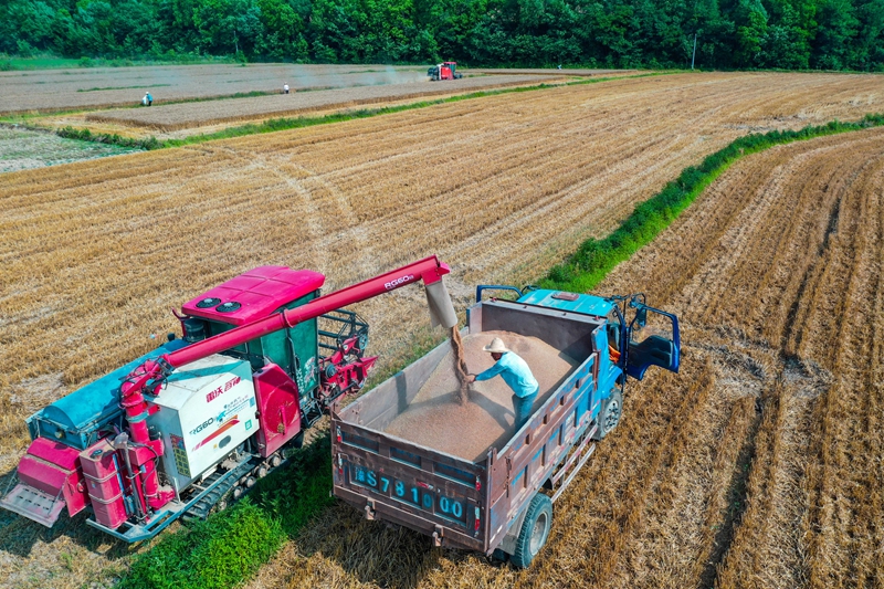 2024年6月1日,在河南省信阳市光山县南向店乡何畈村鑫磊合作社,社员将收获的小麦装车(无人机照片)。新华社发(谢万柏 摄)