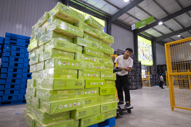 在山西省临汾市隰县玉露香梨智能化分选基地,工作人员把包装好的玉露香梨运往出货口(2021年9月14日摄)。新华社记者 杨晨光 摄