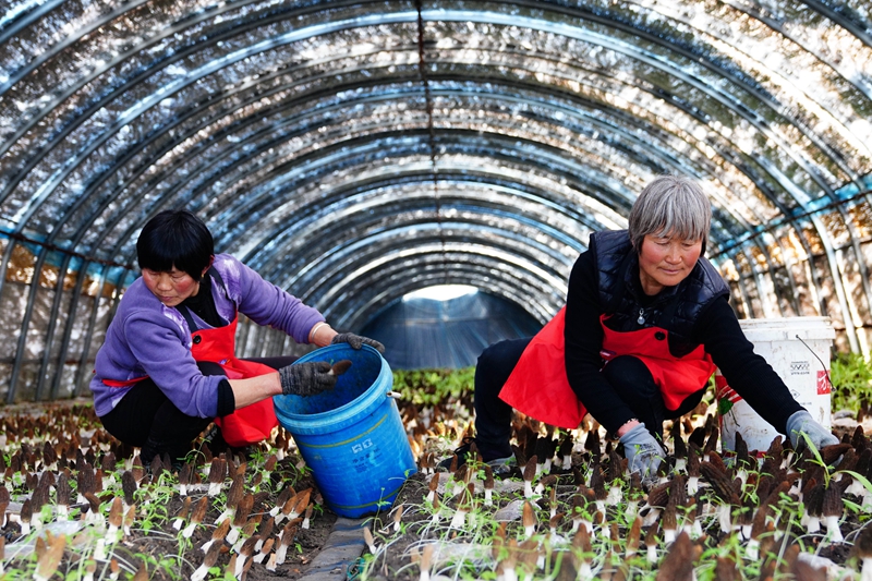 2024年3月20日,农民在山东省济宁市微山县驩城镇袁堂华能光伏电站农光互补项目的大棚里采摘羊肚菌。该项目是采煤塌陷区综合整治项目,集农光互补、渔光互补于一体。新华社记者 郭绪雷 摄