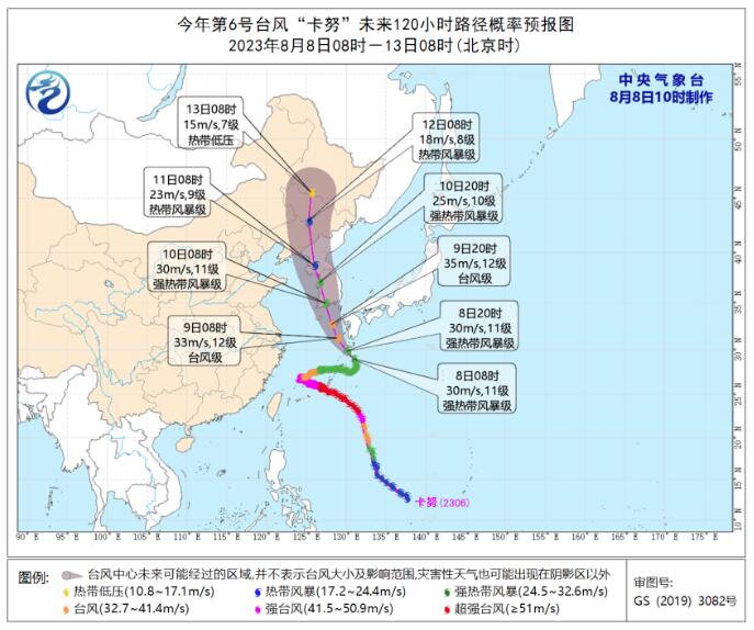 大风预报:8月8日14时至9日14时,巴士海峡、台湾海峡北部、台湾以东洋面、黄海南部部分海域、东海南部和东部及钓鱼岛附近海域将有6-7级、阵风8-9级的大风,其中东海东部部分海域风力可达8-10级,阵风11-12级,“卡努”中心经过的附近海域风力可达11-12级,阵风13-14级。
