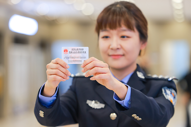 12月1日,民警在天津市公安局出入境管理局展示新版中华人民共和国外国人永久居留身份证。
