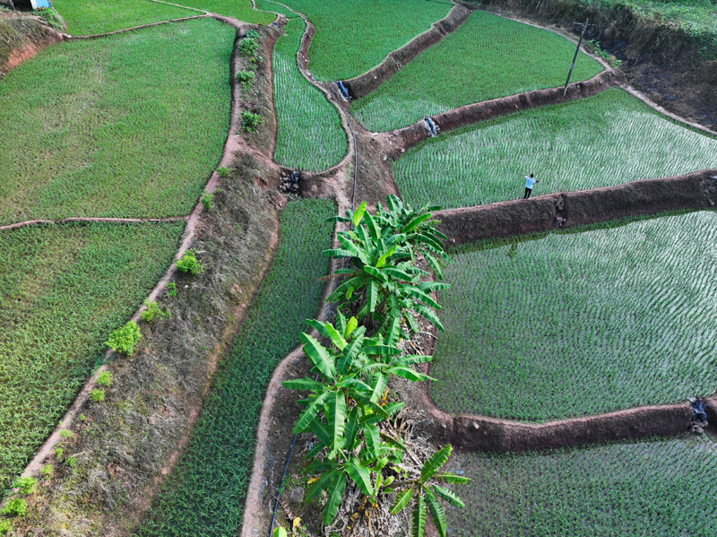 6月8日,在云南省景洪市基诺山基诺族乡司土村,农民在田间查看水稻长势(无人机照片)。