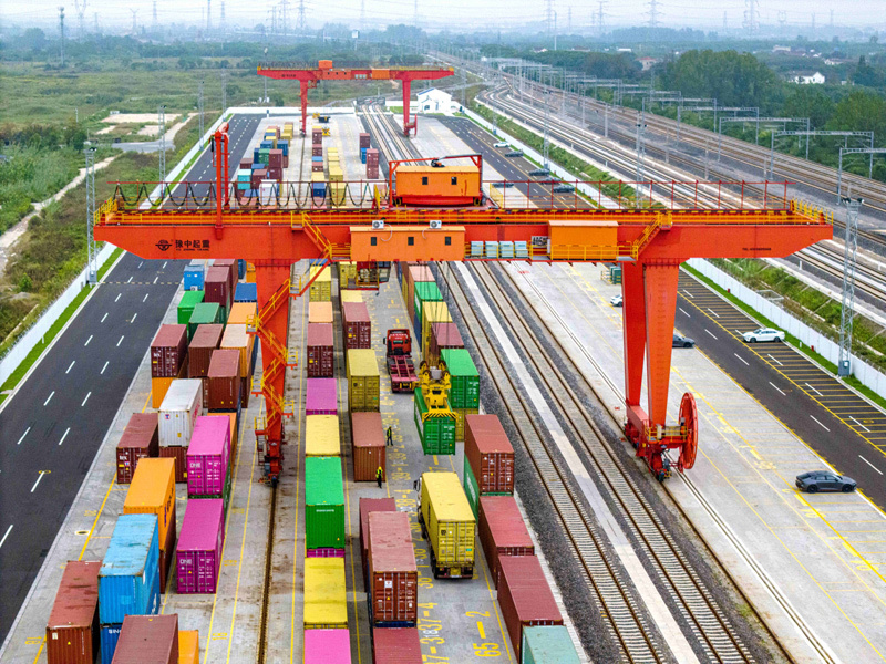 10月13日,在江苏省扬州市江都商贸物流园铁路物流基地,大型起重设备在起吊集装箱,这些集装箱将通过海铁联运列车发往上海芦潮港准备出口(无人机照片)。