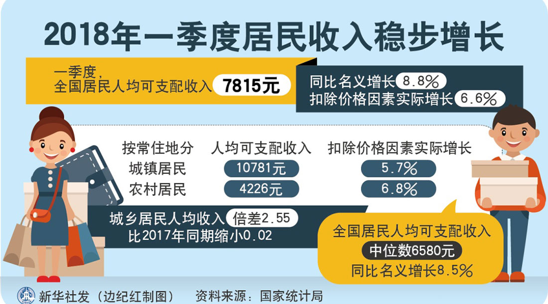 2018年一季度,全国居民人均可支配收入7815元,比上年同期名义增长8.8%,扣除价格因素,实际增长6.6%。其中,城镇居民人均可支配收入10781元,增长8.0%,扣除价格因素,实际增长5.7%;农村居民人均可支配收入4226元,增长8.9%,扣除价格因素,实际增长6.8%。